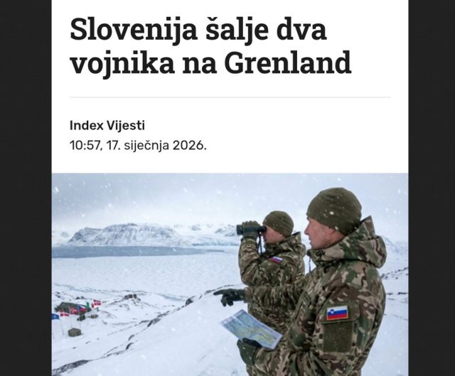 LJUBLJANA / NUUK – Vlada Slovenije potvrdila je da na Grenland šalje dvojicu vojnika, koji će pod vođstvom Danske učestvovati u međunarodnoj vojnoj vežbi „Arktička izdržljivost“, čiji je cilj odvraćanje Sjedinjenih Američkih Država od eventualnog „milom ili silom“ preuzimanja ostrva.