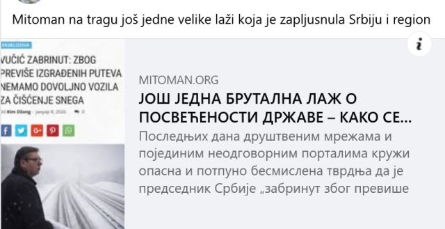 Portal Zicer najoštrije demantuje navode režimskog portala mitoman.org pod naslovom JOŠ JEDNA BRUTALNA LAŽ O POSVEĆENOSTI DRŽAVE – КAКO SE GRAĐANI OBMANJUJU BEZ IMALO SRAMA u kojem se iznose gnusne neistine da predsednik Srbije Aleksandar Vučić nije zabrinut zbog situacije na putevima, te da je vest o „previše izgrađenih saobraćajnica i premalo vozila za čišćenje snega“ navodno „logički neodrživa“.