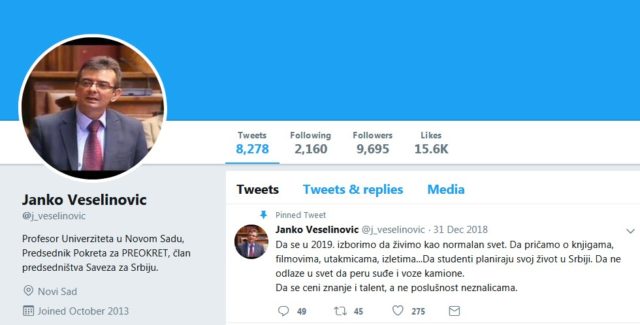 Hey @SavezZaSRB ko stoji iza onog lažnog nicka Janko Veselinović šatro profesor na Univerzitetu ne zna gramatiku,postavlja slike Pariza kaže vidite protesty u Beogradu, sad piše pobedio kaže Vučić je gotov! Daj stvarno ukinite taj profil, pomisliće neko stvarno postoji taj čovek!