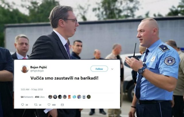 Kako Zicer saznaje, Pajtić je juče doleteo iz Nemačke avionom na Kosovo i ekspresno dobio od engleske službe policijske uniforme i statiste iz Demokratske stranke iz Niša, koji su glumili kosovske policajce. Sam Pajtić se na Tviteru izleteo i rekao da je zaustavio Vučića na barikadi.