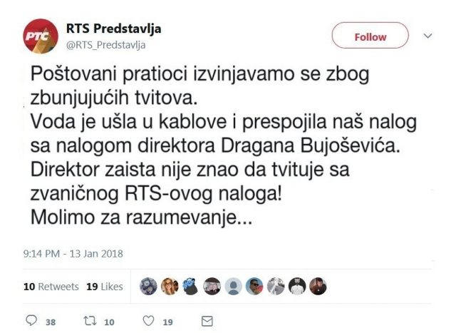 Kako RTS objašnjava „Voda je ušla u kablove“ te prespojila zvanični RTS nalog sa nalogom direktora Bujoševića. Otuda je proizašao sav nesporazum. Bujošević je, naime, mislio da tvituje sa svog privatnog naloga.