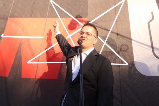 Predsednički kandidat Vuk Jeremić juče je u Novom Sadu vratio satanistički mural, koji je na zahtev vladike Irineja Bulovića bio uklonjen.