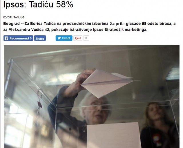 Podsećamo čitaoce da je i 2012. agencija IPSOS isto Tadiću davala 58% i sigurnu pobedu u odnosu na tadašnjeg kandidata a sadašnjeg predsednika Tomislava Nikolića.
