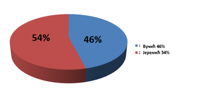Po ovim istraživajima neminovan je drugi krug izbora na kome Jeremić dobija 54% glasova a Vučić 46%.