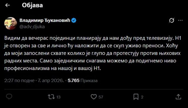 Čuveni advokat Vladimir Đukanović jedan od osnivača SNS i aktuelni vlasnik N1 televizije, objavio je na svom X nalogu da neće biti nikakvih drastičnih promena na toj televiziji, te da će N1 nastaviti objektivno da izveštava kao i do sada.