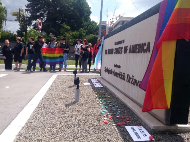 Ispred američke Ambasade u Beogradu okupilo se 50-ak pripadnika LGBT manjine koja je zahtevala da ih ambasador Kajl Skot primi hitno.